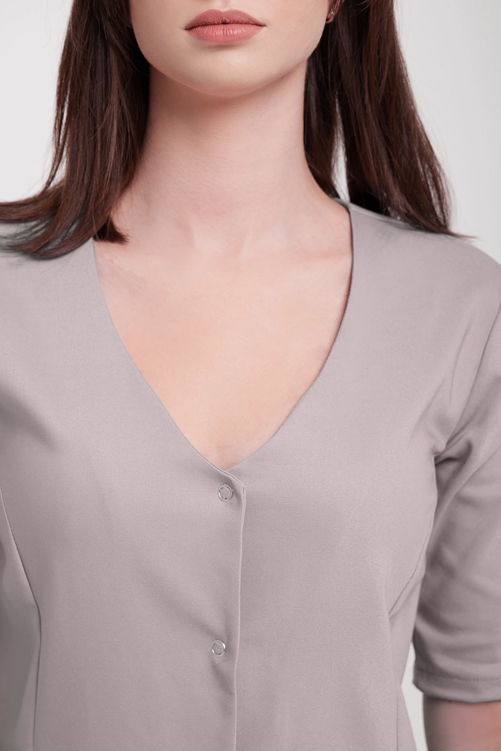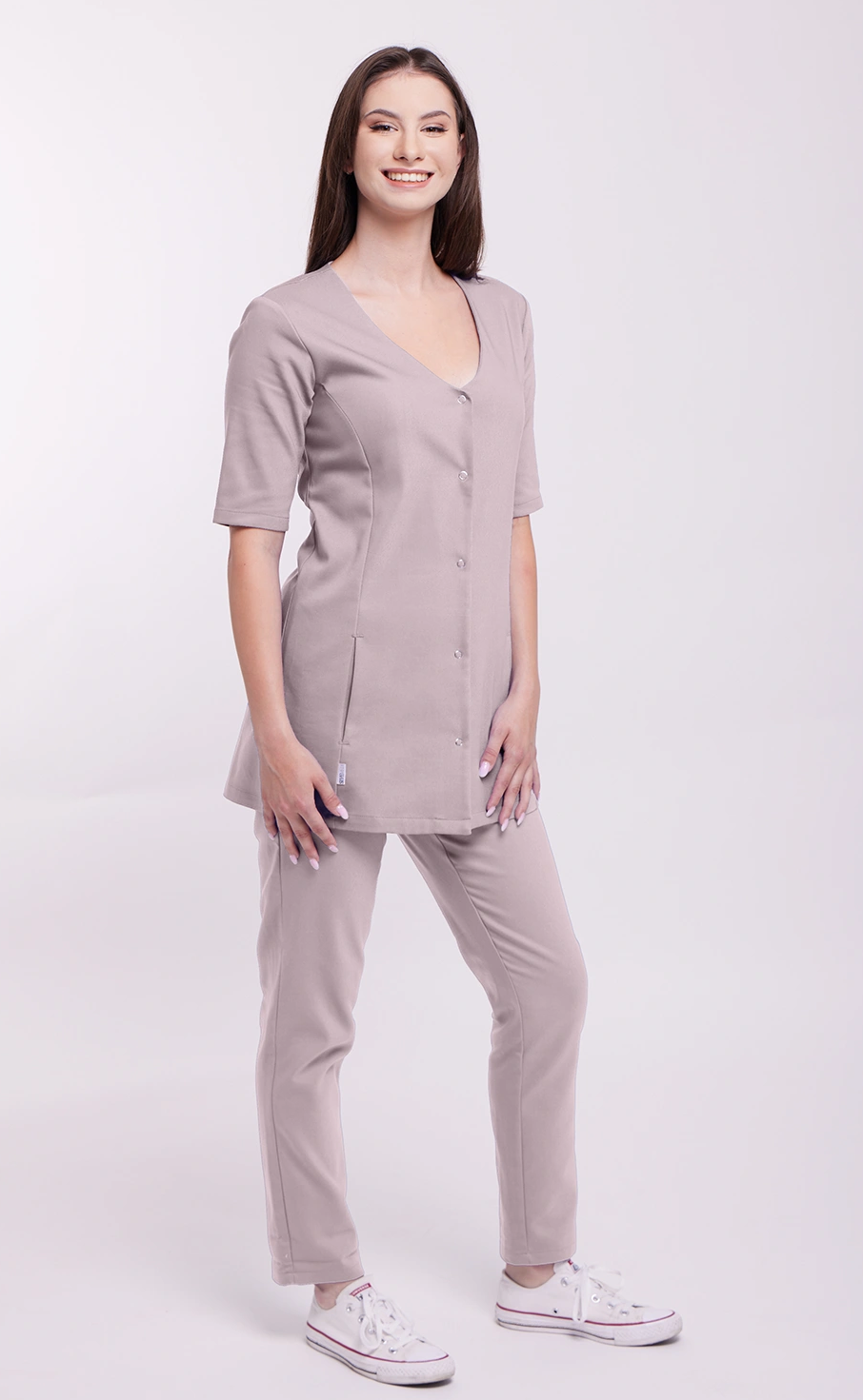 Bluzka medyczna rozpinana została uszyta z mięsistego i elastycznego materiału. Posiada lekko taliowany krój, dekolt w kształcie v-neck i dwie pojemne kieszenie. Długość uszyta tak, by zapięta mogła posłużyć za bluzkę/tunikę za pupę a rozpięta posłużyła za narzutkę lub krótki fartuch.