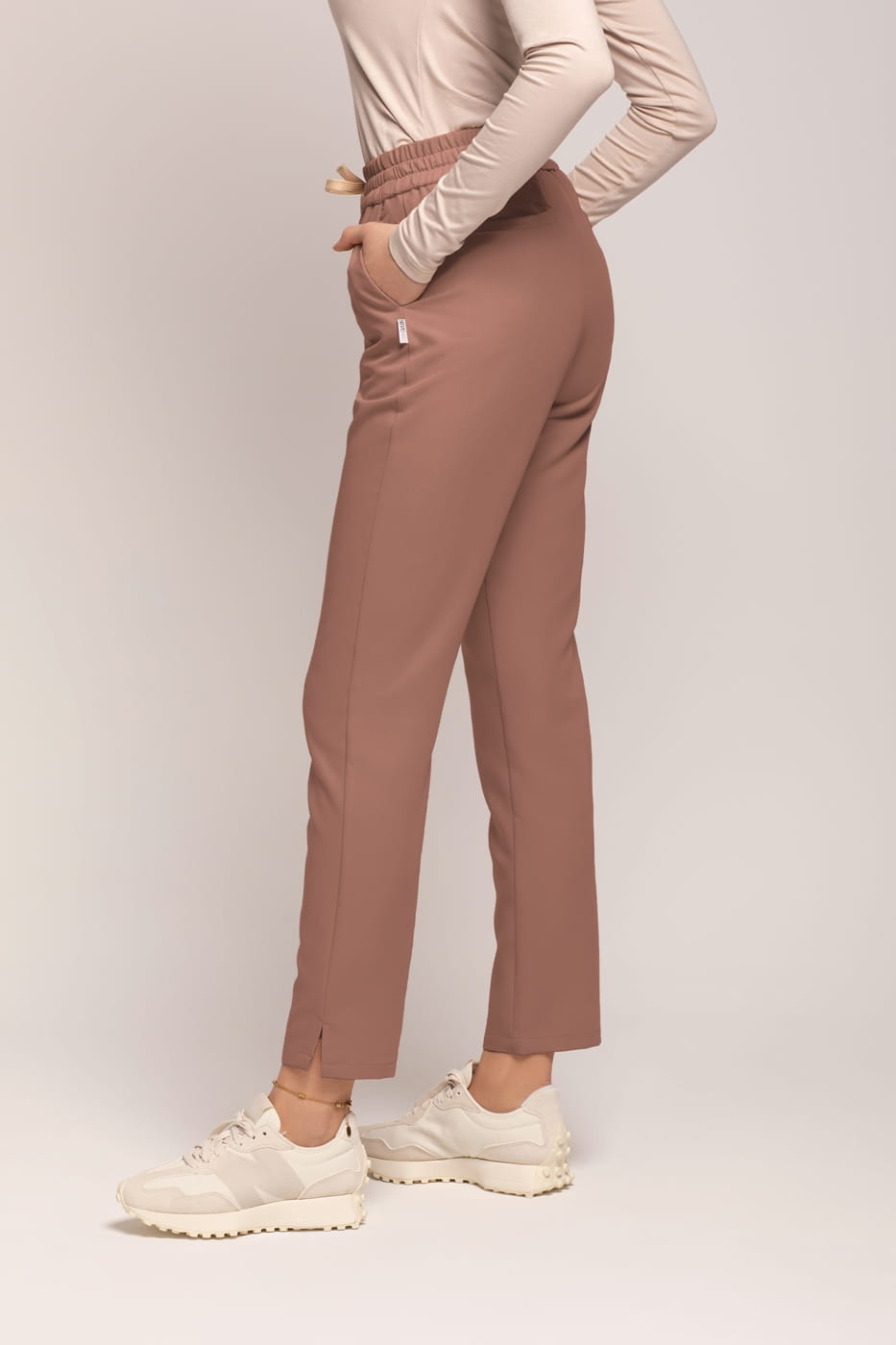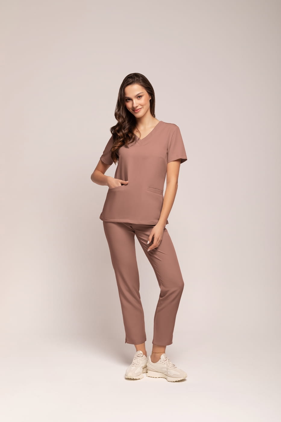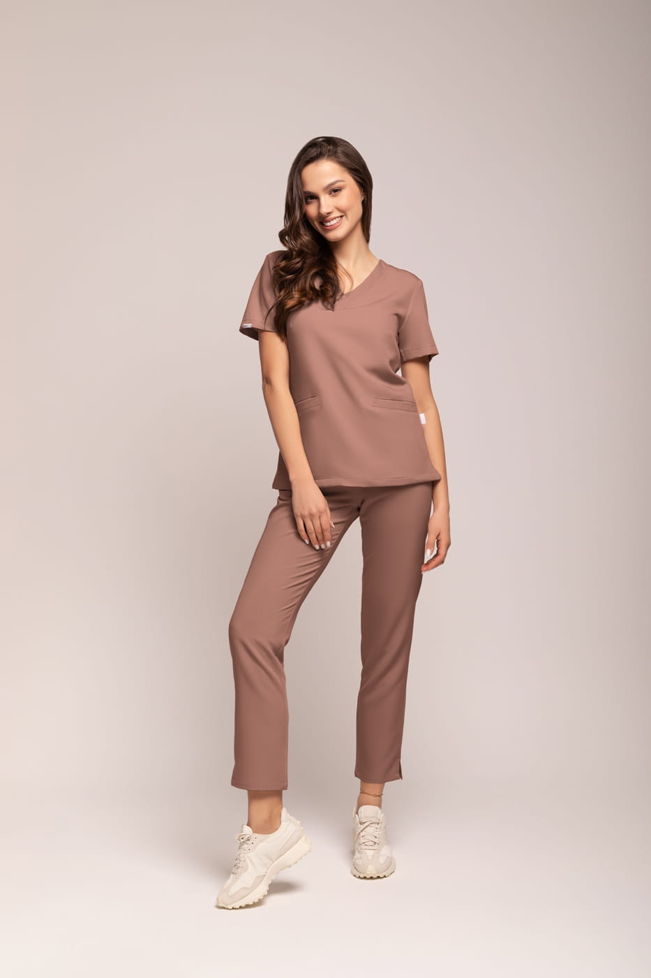 Spodnie medyczne Classic to połączenie wygody, nowoczesnego designu i funkcjonalności, których potrzebujesz w codziennej pracy. Wykonane z cienkiego, przewiewnego materiału, idealnie sprawdzą się w dynamicznym środowisku medycznym, zapewniając komfort nawet podczas wielogodzinnych dyżurów. Spodnie proste są klasyką zamkniętą w prostą, lekko zwężaną nogawką z delikatnymi rozcięciami po zewnętrznej stronie, dwiema kieszeniami przednimi. Kieszenie tylnie stanowią jedynie imitacje kieszeni nadając spodniom elegancki wygląd. Całość dopełnia sznurek w kolorze cappuccino podkreślając kolor mokki.