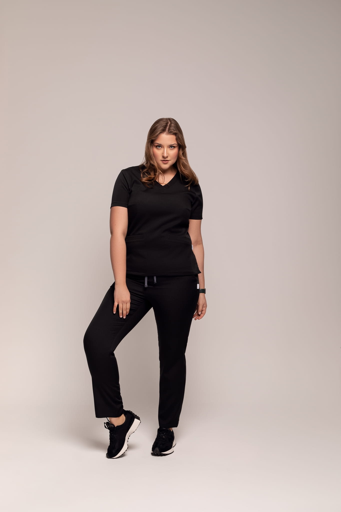 Spodnie medyczne joggery premium. Klasyczne spodnie z gumką na nogawce, z wysokim stanem z bardzo dobrej jakości mieszanki bawełny i poliestru. Model ten posiada dwie pojemne kieszenie przednie i dwie kieszenie naszywane tylne. Całość dopełnia piękny sznurek.