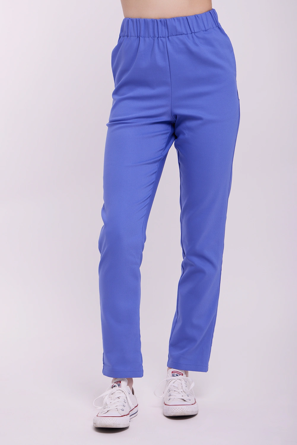 Spodnie medyczne proste z kolekcji softline., klasyczne z wysokim stanem z bardzo dobrej jakości mieszanki bawełny i poliestru Model ten posiada dwie pojemne kieszenie przednie i dwie kieszenie ukryte tylne z klasycznymi lamówkami. Gumka w pasie tworząca eleganckie wykończenie.